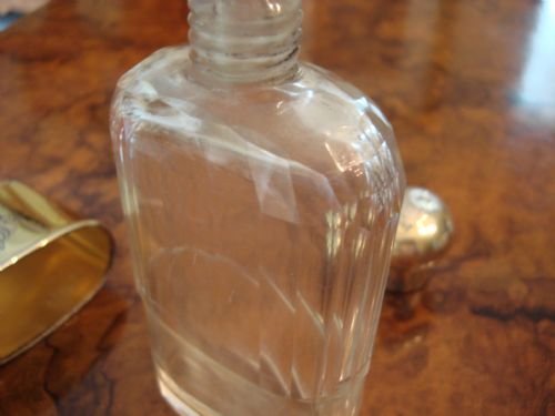 This lovely flask has a beautifully cut panel cut glass body with facet cut shoulders. The top is solid silver gilt, as is the heavy gauged removable drinking cup base. Both silver drinking cup and the top have very nicely and ornately engraved initials, and both are identically hallmarked.