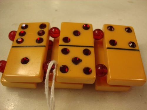 Circa 1940 very striking and unusual domino bracelet made with vintage Bakelite dominoes strung on elasticated bands, and separated by red glass beads. Also, unusually, the number markers are made with sparkly paste jewels.