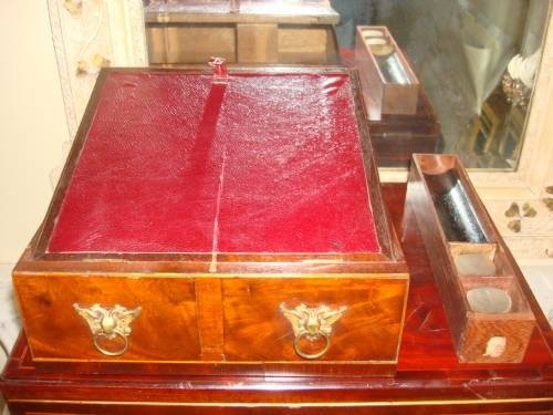 From a large home in Sussex, with many family antiques, a 19th century Georgian mahogany and walnut inlaid antique paint box/work box having a rising lid with fitted interior containing lidded velvet lined compartments with ivory knobs above a removable leather topped writing slope, containing a slide out pen tray and ink drawer including original cast brass topped inkwells. A fitted drawer is found next to writing slope.