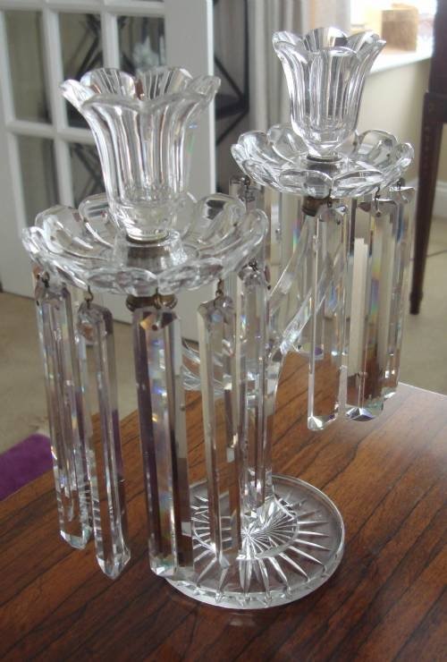 Circa 1900 lovely 2 branch glass candelabra with original prism cut drop lustres.