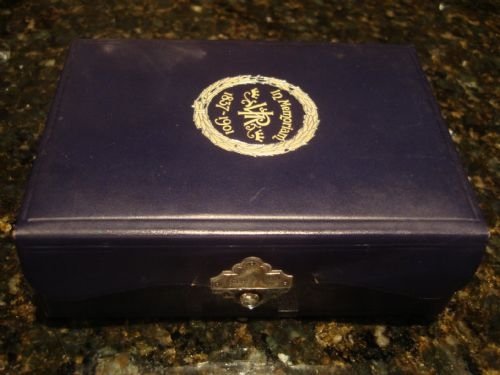 The dark blue Moroccan leather case bears an embroidered plaque that says "In Memoriam 1837-1901," and the Royal cypher. It is surrounded by a wreath of laurel leaves. It is lined in cream coloured moire silk, and has a beautifully shaped English hallmarked solid silver fully hallmarked button operated clasp, hallmarked Birmingham 1900, and made by Charles Penny Brown, and the leather cover closure is similarly shaped. There are two small marks to the leather on either side of the clasp.